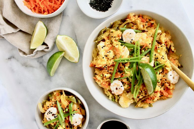 Using same pan, add the remaining oil or ghee to the pan. Sauté the onion, snap peas and carrots, stirring until just tender, about two minutes. Add the spaghetti squash, shrimp and egg to the pan until everything is mixed and heated through.