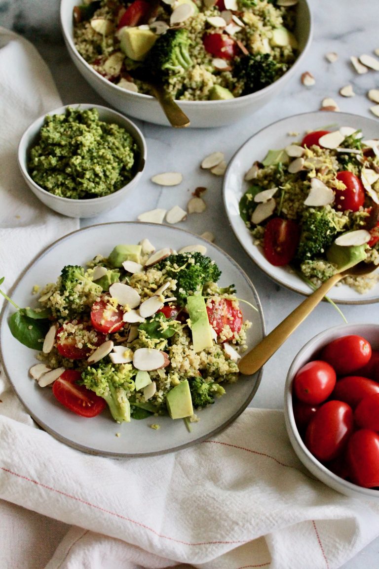 Toss the quinoa with the broccoli pesto and the broccoli florets until well coated, then gently stir in the slivered almonds, tomatoes, basil, lemon zest and red pepper flakes.