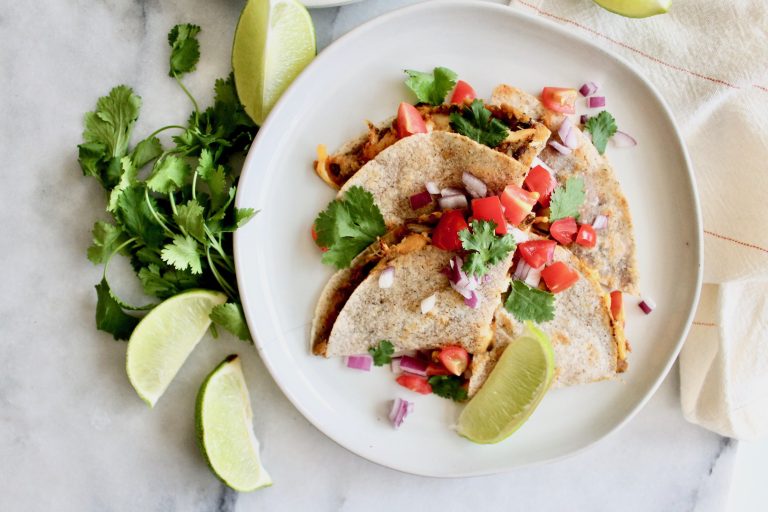 Place other tablespoon of oil or ghee into large skillet, add quesadilla and cook until cheese melts, about 4 minutes per side. Cut quesadillas into halves and serve with salsa and lime.