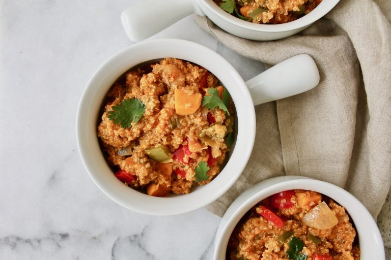 Drizzle oil in the bottom of a 9x13 baking dish. Then add chicken, veggies, quinoa, and spices and give everything a good stir.