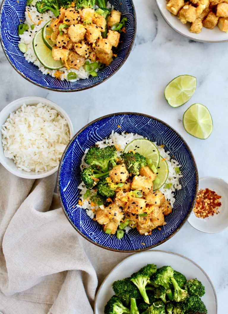Once the tofu is cooked, divide the sauce between the tofu and the broccoli, and stir so that both are covered. Serve over rice with extra squeezes of lime, scallions, and sesame seeds.
